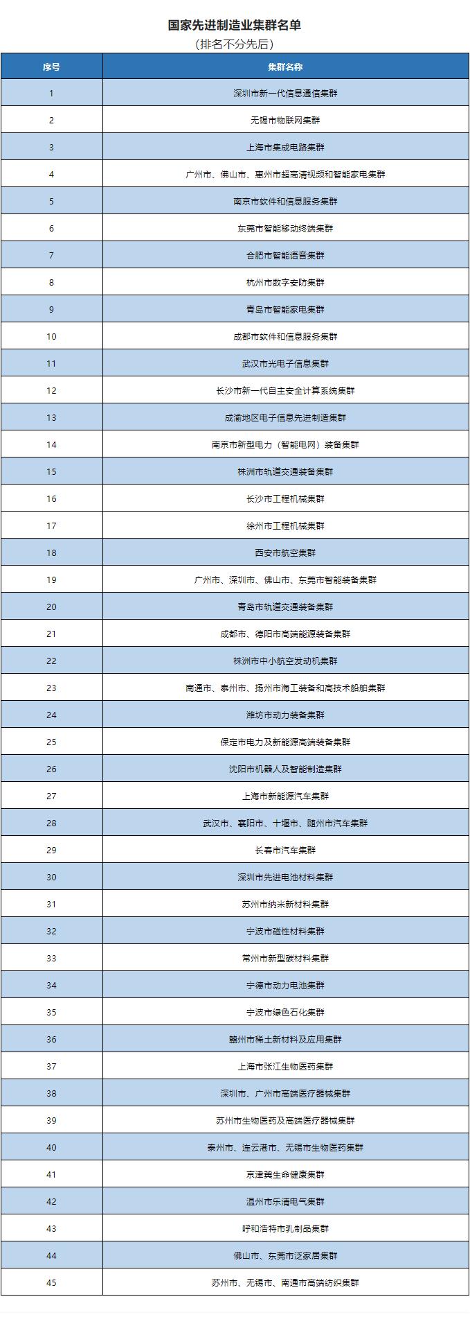 11月30日,工信微报发布消息,工业和信息化部正式公布45个国家先进制造集群的名单。